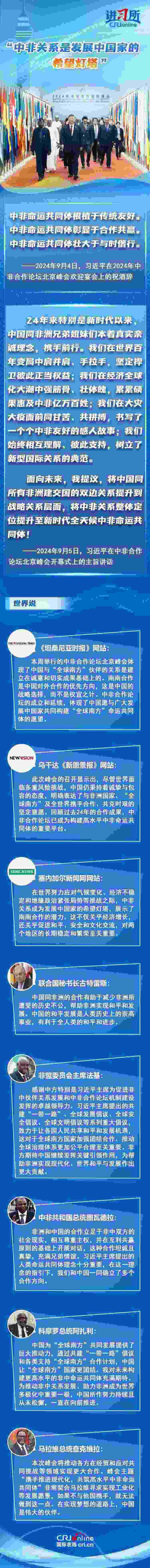 從宣布建立“新型伙伴關系”,到整體定位提升至“新時代全天候中非命運共同體”,成立24年的中非合作論壇不斷推動中非關系實現(xiàn)跨越式發(fā)展,特別是新時代以來,中國本著真實親誠理念,同非洲兄弟姐妹們攜手前行,受到非方廣泛稱贊。非方各界認為,為推動非中關系發(fā)展、助力非洲成為世界多極化中重要一極,中國所作努力持續(xù)且從未松懈,中非關系是發(fā)展中國家的希望燈塔。