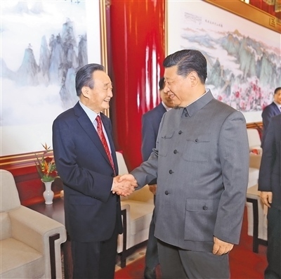 2021年7月1日,慶祝中國共產(chǎn)黨成立100周年大會(huì)在北京天安門廣場(chǎng)隆重舉行。這是慶祝大會(huì)前,習(xí)近平同志與吳邦國同志握手。新華社記者 鞠 鵬攝