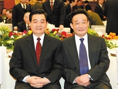 二〇〇五年一月一日,全國政協(xié)在北京舉行新年茶話會(huì)。這是胡錦濤同志與吳邦國同志在一起。新華社記者 樊如鈞攝