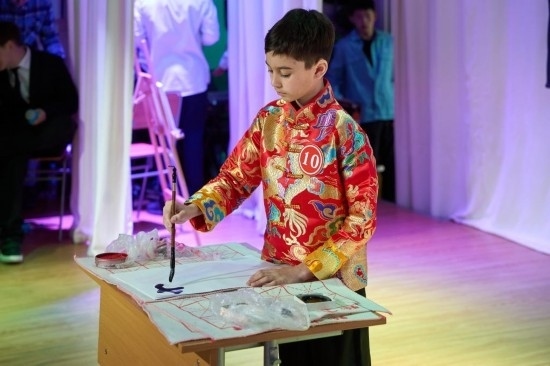 4月9日,在俄羅斯符拉迪沃斯托克,一名小學(xué)生展示中文書法。2024年中小學(xué)生“漢語橋”中文比賽4月9日在符拉迪沃斯托克市國際語言學(xué)校舉行。新華社發(fā)