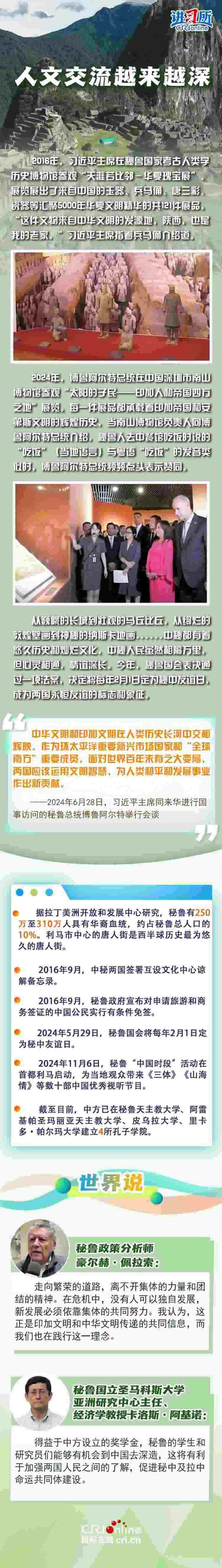 時(shí)隔八年,習(xí)近平主席的秘魯之行即將開啟,兩國元首半年內(nèi)實(shí)現(xiàn)互訪,體現(xiàn)出雙方高水平的政治互信。中秘這對(duì)跨洋“友鄰”也必將在元首外交的戰(zhàn)略引領(lǐng)下,抒寫更多民相親、心相通的動(dòng)人故事。