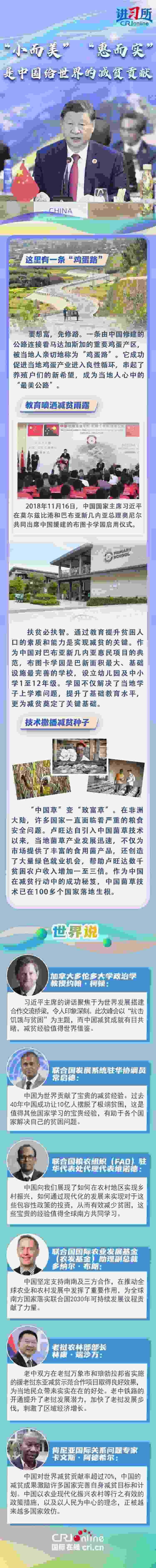 “世界繁榮穩(wěn)定不可能建立在貧者愈貧、富者愈富的基礎(chǔ)之上?!苯陙?,中國一直在用實際行動與世界分享脫貧經(jīng)驗:與東盟國家共同開展鄉(xiāng)村減貧推進計劃,在非洲開展基礎(chǔ)設(shè)施建設(shè)和農(nóng)業(yè)、醫(yī)療等技術(shù)合作援助項目,在拉美援建農(nóng)業(yè)技術(shù)中心......一批批“小而美”“惠而實”的民生項目落地生根,幫助當?shù)孛癖姅[脫貧困。多國人士表示,中國成功打贏脫貧攻堅戰(zhàn)具有世界意義,不僅為發(fā)展中國家提供了借鑒經(jīng)驗,更有助于推動建設(shè)一個共同發(fā)展的公正世界。