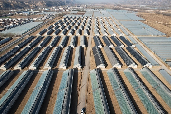 2023年11月26日,甘肅省平?jīng)鍪袥艽h涇汭河川區(qū)萬畝設(shè)施蔬菜產(chǎn)業(yè)園王村核心區(qū)(無人機(jī)照片)。這是當(dāng)?shù)匾劳刑旖蚴袞|西部協(xié)作幫扶資金實施的聯(lián)建項目。新華社記者 范培珅 攝