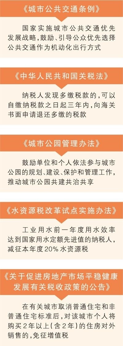 編者按:鼓勵(lì)、引導(dǎo)公眾優(yōu)先選擇公共交通作為機(jī)動(dòng)化出行方式;保持現(xiàn)行關(guān)稅稅制基本穩(wěn)定;鼓勵(lì)單位和個(gè)人參與城市公園的規(guī)劃、建設(shè)、管理……12月起,《城市公共交通條例》《中華人民共和國(guó)關(guān)稅法》《城市公園管理辦法》等一批法律法規(guī)正式施行,切實(shí)以法治力量推動(dòng)經(jīng)濟(jì)社會(huì)高質(zhì)量發(fā)展。
