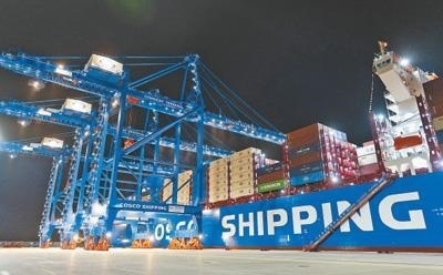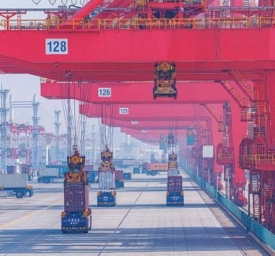 軟聯(lián)通共建“一帶一路”國家在工作制度對(duì)接、技術(shù)標(biāo)準(zhǔn)協(xié)調(diào)、檢驗(yàn)結(jié)果互認(rèn)等方面強(qiáng)化合作、統(tǒng)一標(biāo)準(zhǔn),貿(mào)易自由化便利化水平不斷提升。上海洋山港海關(guān)對(duì)接共建國家進(jìn)出口貨物相關(guān)標(biāo)準(zhǔn),推動(dòng)通關(guān)一體化方式申報(bào),提升通關(guān)效率。圖為無人駕駛的全自動(dòng)導(dǎo)引車在洋山港穿梭往來,搬運(yùn)集裝箱。王 初攝(影像中國)