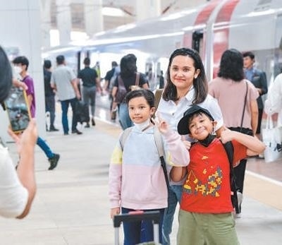 硬聯(lián)通雅萬高鐵是我國在境外完成全過程勘察設(shè)計(jì)建設(shè)的首個(gè)高鐵項(xiàng)目,于去年10月17日正式開通運(yùn)營,是中印尼共建“一帶一路”合作的典范。圖為乘客在和雅萬高鐵動(dòng)車組合影留念。新華社記者 徐 欽攝