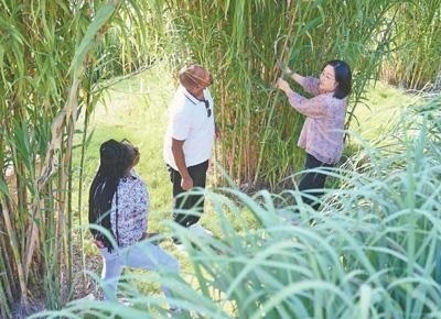 心聯(lián)通福建農(nóng)林大學(xué)國際菌草工程技術(shù)研究中心工作人員(右)在向盧旺達(dá)留學(xué)生介紹菌草品種“綠洲1號(hào)”蘆竹的生長(zhǎng)情況。新華社記者 林善傳攝