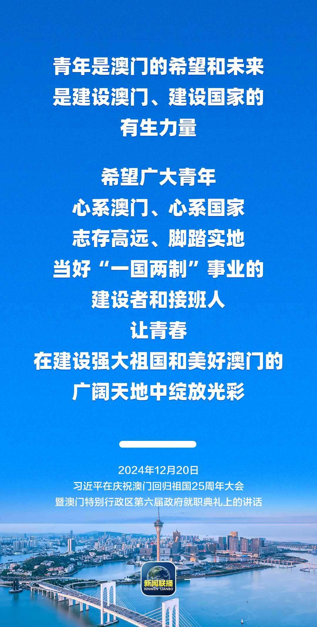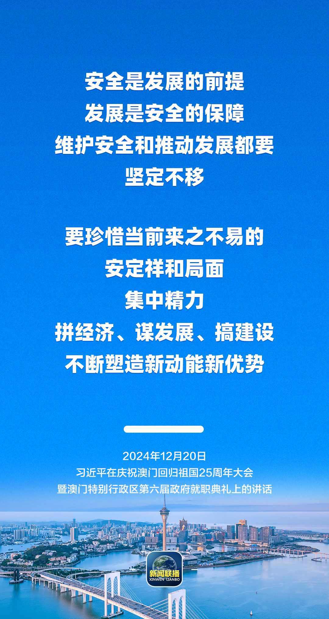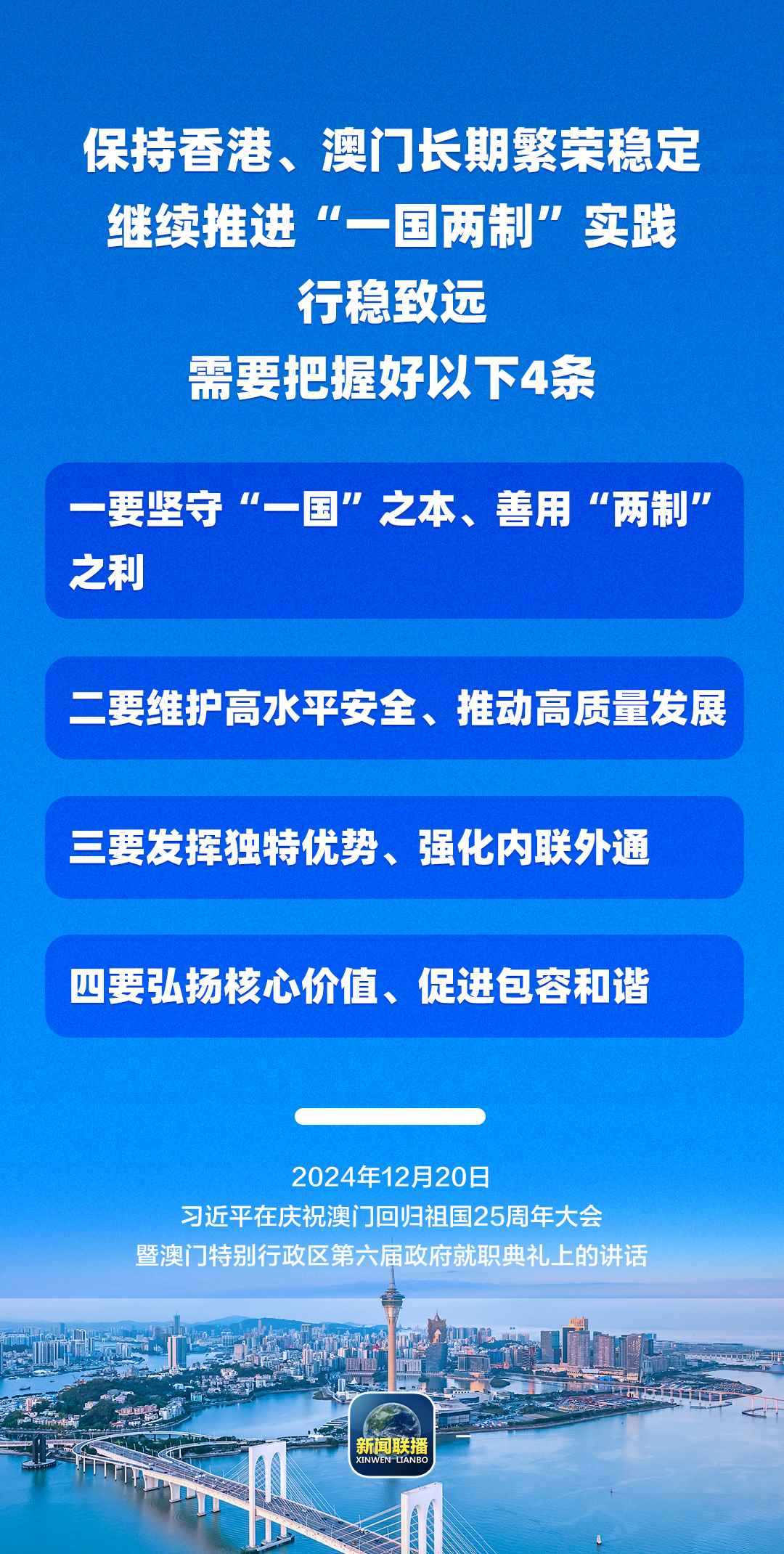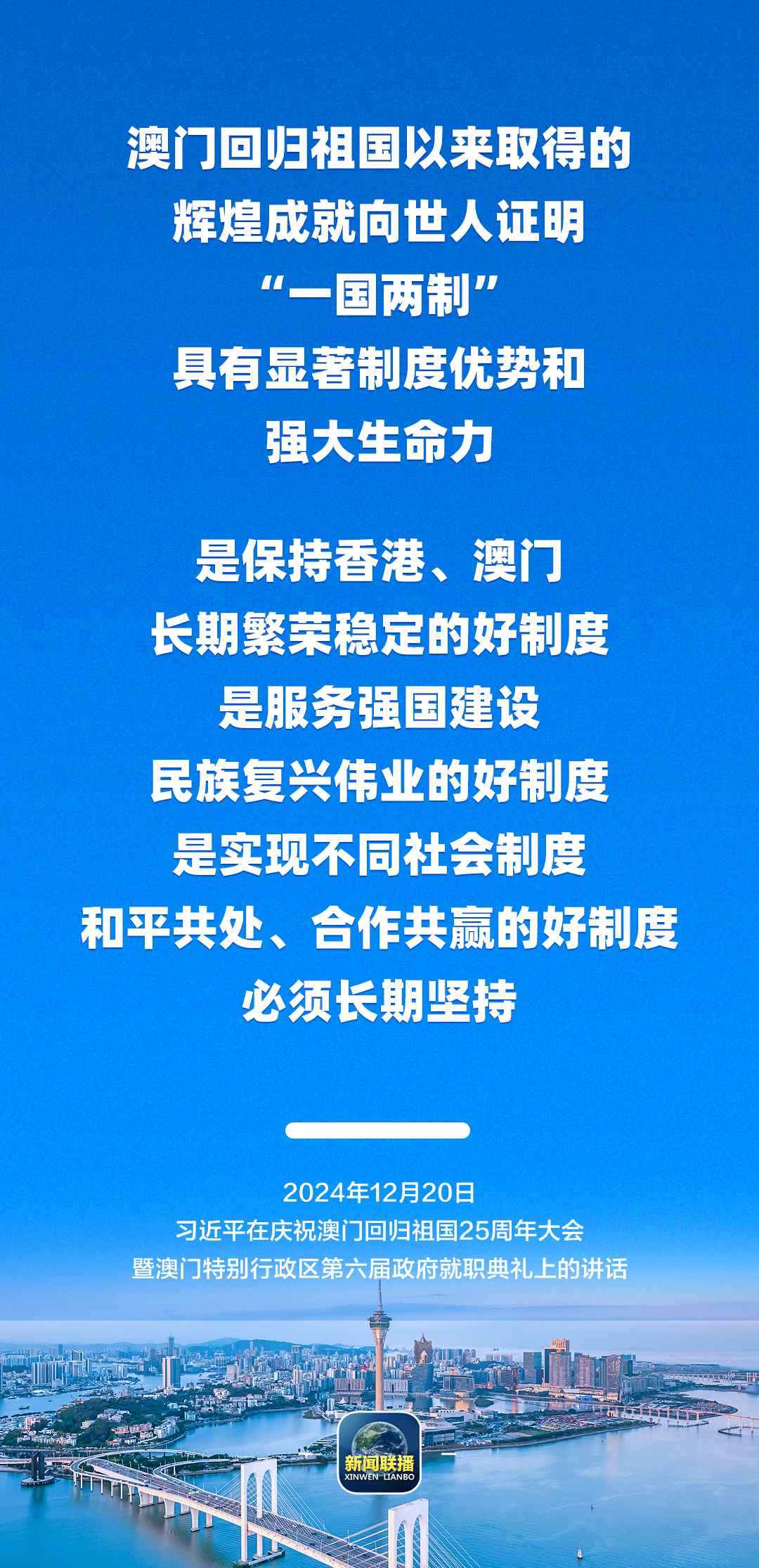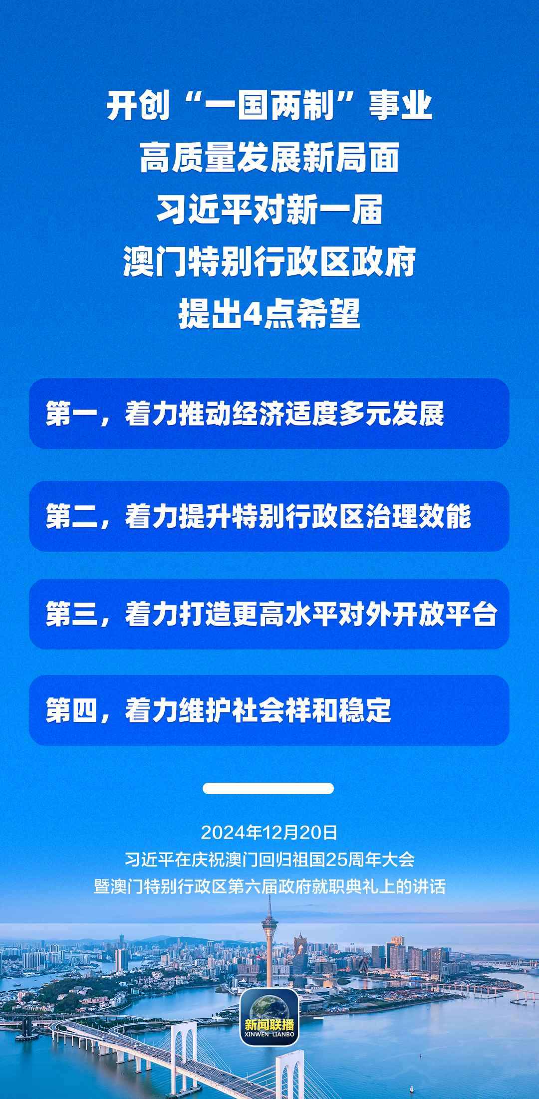 習(xí)近平強(qiáng)調(diào),只要全面準(zhǔn)確、堅(jiān)定不移貫徹“一國兩制”方針,有特別行政區(qū)政府和社會各界共同努力,有偉大祖國作堅(jiān)強(qiáng)后盾,澳門一定能打開發(fā)展新天地、不斷創(chuàng)造新輝煌,一定能為以中國式現(xiàn)代化全面推進(jìn)強(qiáng)國建設(shè)、民族復(fù)興偉業(yè)作出更大貢獻(xiàn)。