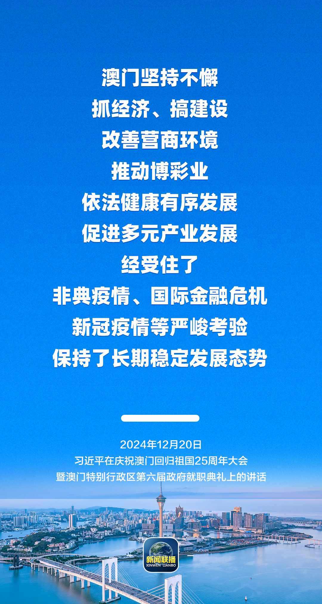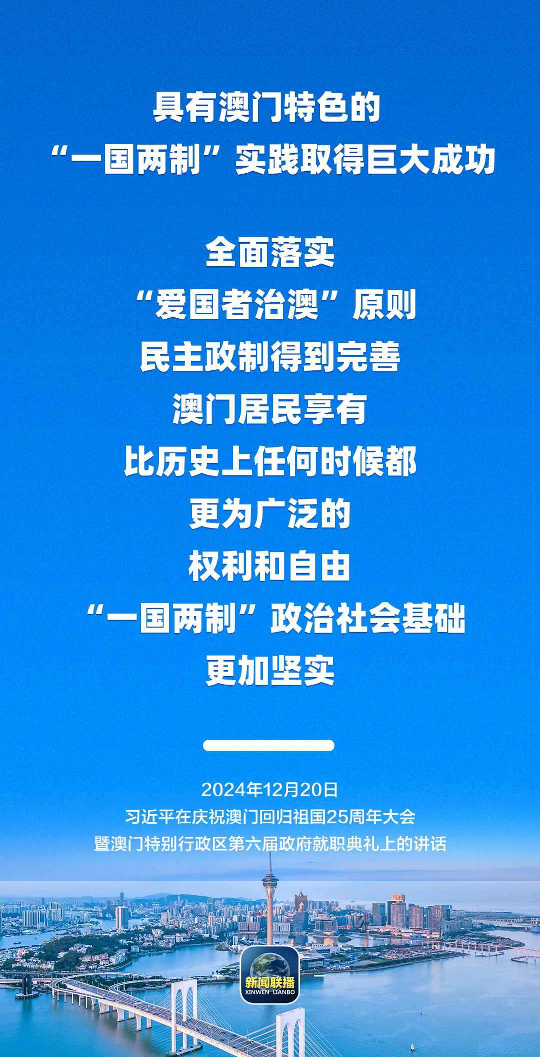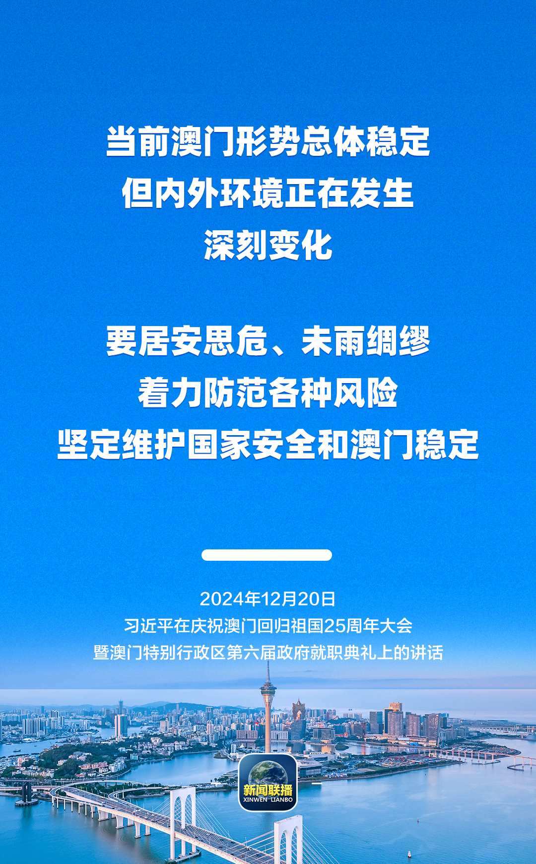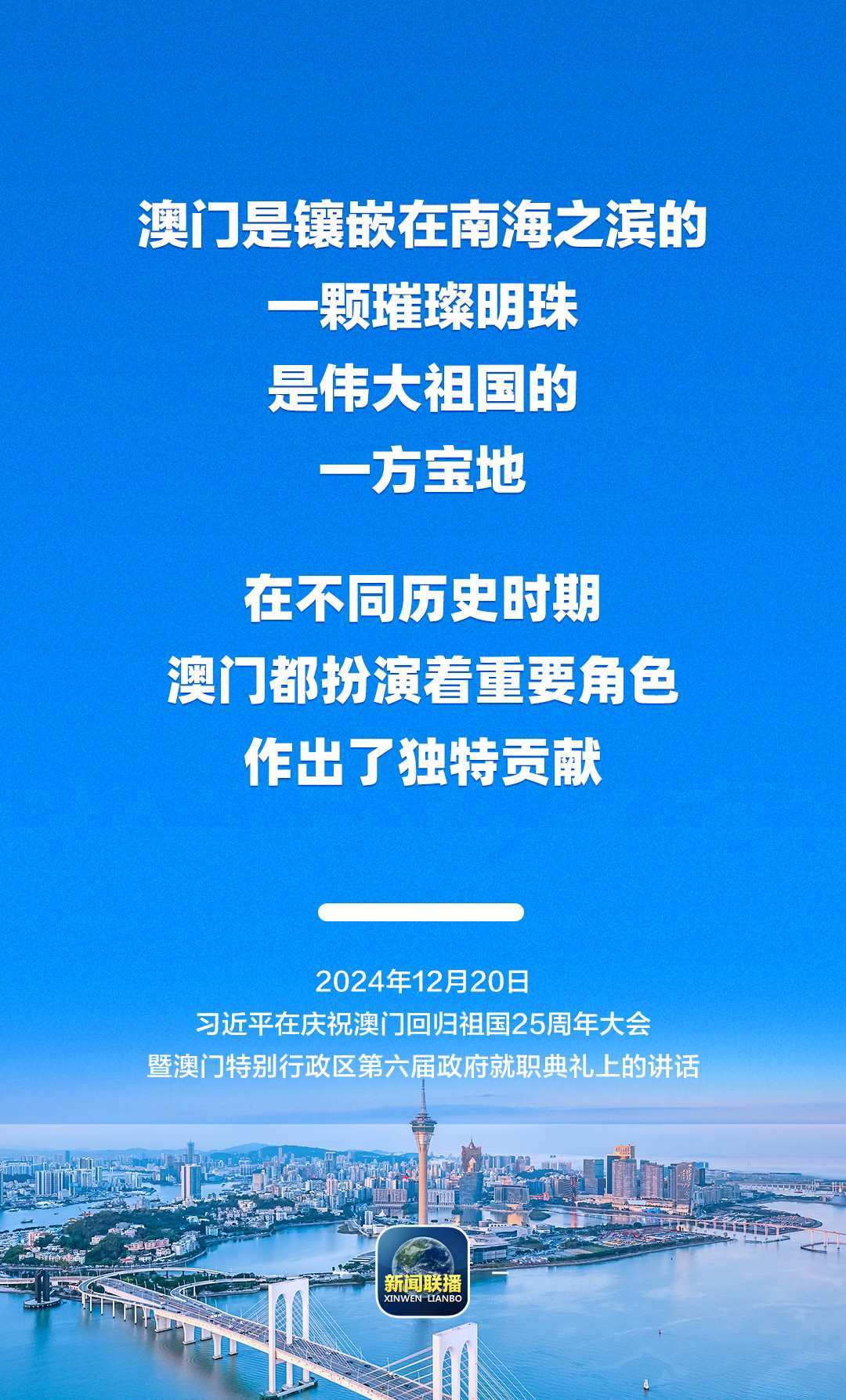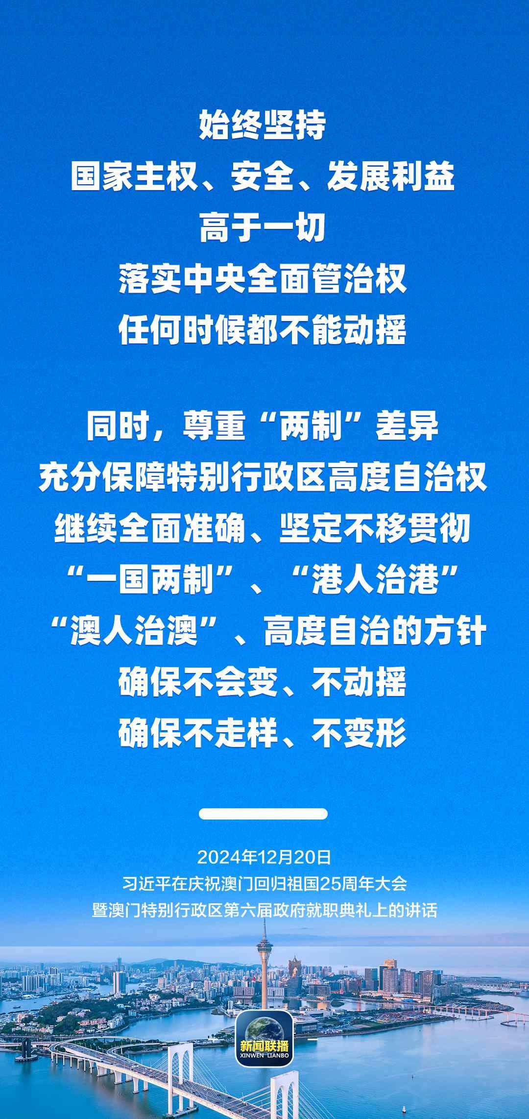 12月20日上午,慶祝澳門回歸祖國25周年大會暨澳門特別行政區(qū)第六屆政府就職典禮舉行。中共中央總書記、國家主席、中央軍委主席習(xí)近平出席并發(fā)表重要講話。