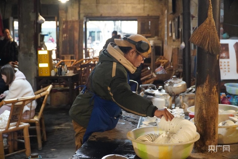 李強(qiáng)正戴著藍(lán)布圍裙,在茶館里忙碌(央廣網(wǎng)記者 昌思榮 攝)
