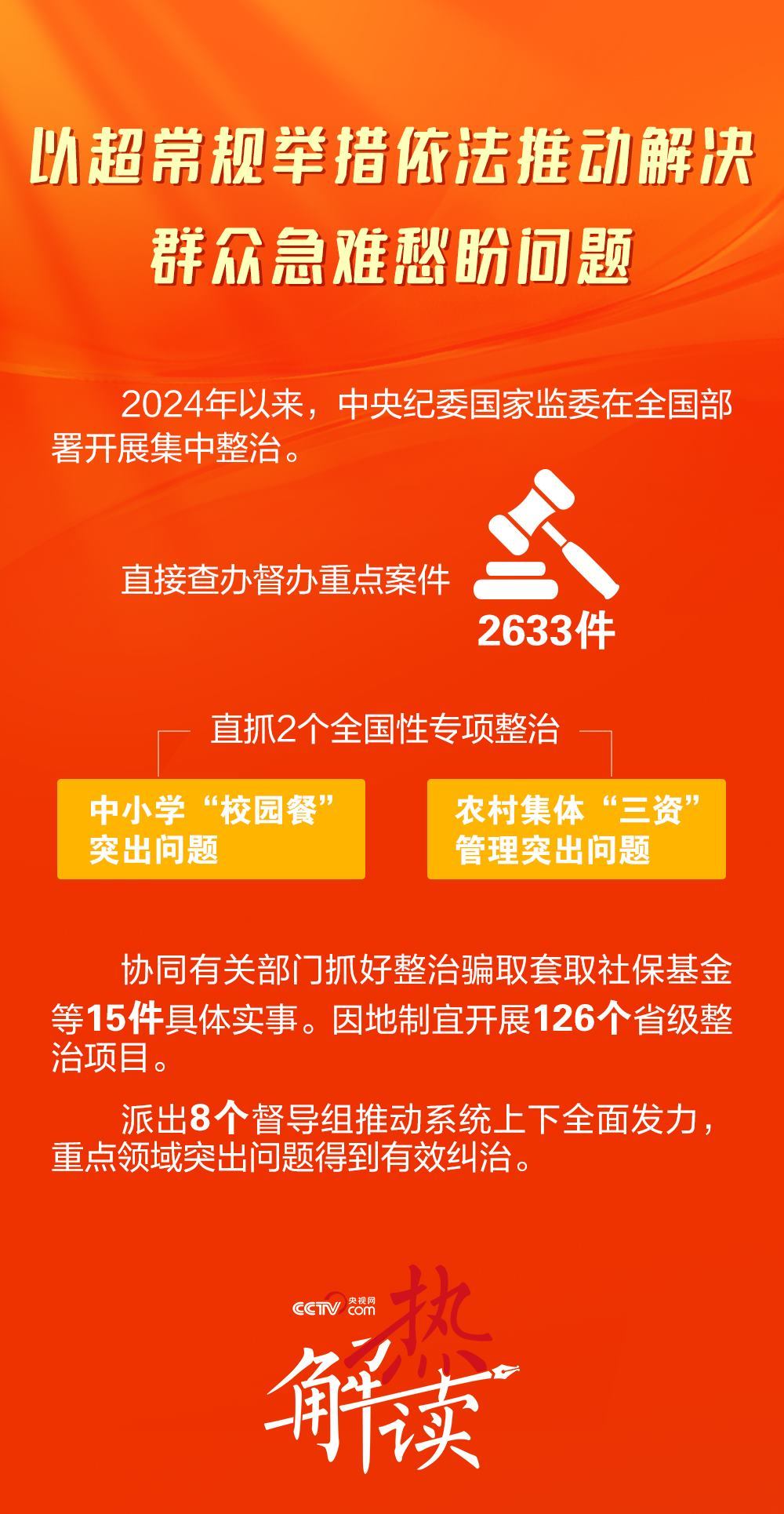 以“校園餐”問題為例。2024年,中央紀(jì)委國家監(jiān)委督促有關(guān)部門首次摸清全國中小學(xué)食堂及供餐情況等底數(shù),指導(dǎo)各級監(jiān)察機(jī)關(guān)依法查處貪占學(xué)生餐費(fèi)、插手招標(biāo)采購、收受回扣等問題3.8萬件,處分2.3萬人。在斬斷伸向“校園餐”的“黑手”的同時,補(bǔ)上了監(jiān)管制度的漏洞。中央紀(jì)委國家監(jiān)委會同教育部、市場監(jiān)管總局、財政部等單位,制定“校園餐”管理監(jiān)督指導(dǎo)意見,推動完善膳食經(jīng)費(fèi)管理等制度,確保每一筆資金來源與去向都在陽光下透明運(yùn)作。