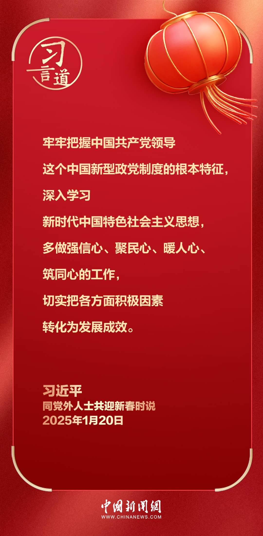 在中華民族傳統(tǒng)節(jié)日乙巳蛇年春節(jié)即將到來(lái)之際,中共中央總書(shū)記、國(guó)家主席、中央軍委主席習(xí)近平20日在人民大會(huì)堂同各民主黨派中央、全國(guó)工商聯(lián)負(fù)責(zé)人和無(wú)黨派人士代表歡聚一堂,共迎佳節(jié)。習(xí)近平代表中共中央,向各民主黨派、工商聯(lián)和無(wú)黨派人士,向統(tǒng)一戰(zhàn)線廣大成員,致以誠(chéng)摯問(wèn)候和新春祝福。