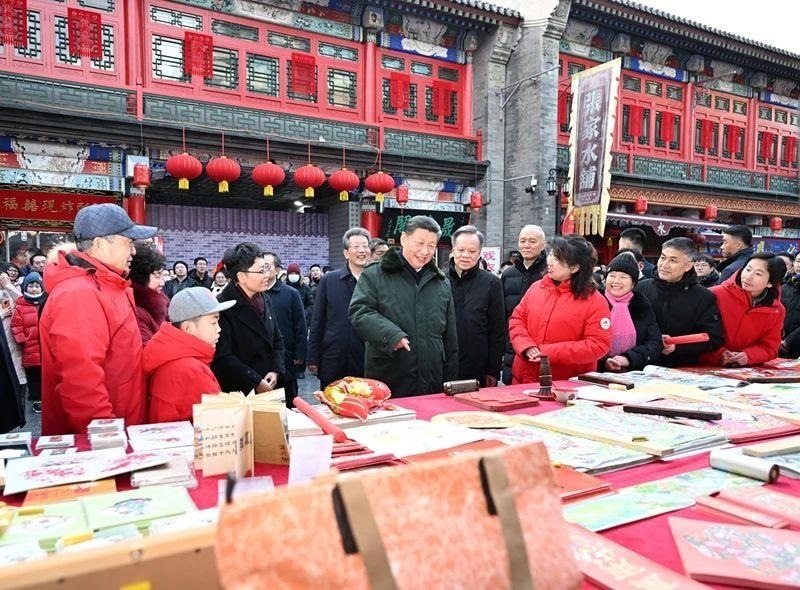 △2024年2月1日,習(xí)近平總書記在天津古文化街考察時,同店鋪員工和現(xiàn)場群眾互動交流。