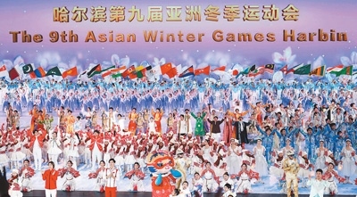 二月七日,第九屆亞洲冬季運動會開幕式在黑龍江省哈爾濱市舉行。圖為演員在開幕式上表演。