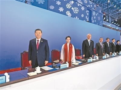 19時58分,在《和平——命運共同體》的樂曲聲中,習(xí)近平和夫人彭麗媛,同國際奧委會主席巴赫、亞奧理事會第一副主席霍震霆等步入主席臺,向觀眾揮手致意。全場響起長時間的熱烈掌聲。