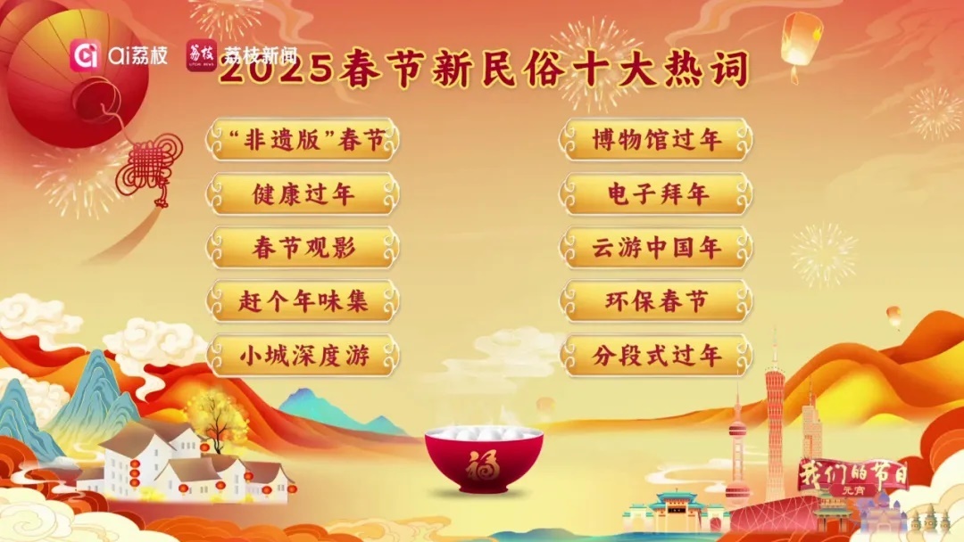 活動(dòng)接近尾聲之際,2025年“春節(jié)新民俗十大熱詞”評(píng)選環(huán)節(jié)正式開啟。通過深入分析微博、微信、抖音及人民網(wǎng)、中國(guó)精神文明網(wǎng)、學(xué)習(xí)強(qiáng)國(guó)、ai荔枝、荔枝新聞等網(wǎng)絡(luò)平臺(tái)上的互動(dòng)留言及熱度指數(shù),與新民俗相關(guān)的20個(gè)高頻熱詞脫穎而出。在短短四天內(nèi),數(shù)十萬網(wǎng)友踴躍參與了網(wǎng)絡(luò)投票。截至2月12日15時(shí),投票總數(shù)已飆升至764832票,當(dāng)晚“我們的節(jié)日 歡樂中國(guó)年”乙巳蛇年元宵特別節(jié)目中,春節(jié)新民俗十大熱詞火熱揭曉。“‘非遺版’春節(jié)”、“健康過年”、“春節(jié)觀影”等熱詞以高票數(shù)位居前列。
