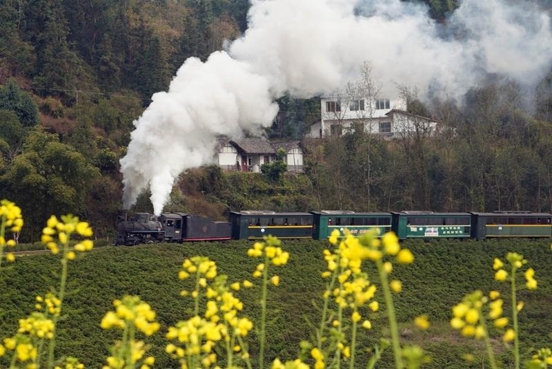 △2025年2月14日,四川樂山市犍為縣菜子壩景點試種的早季油菜花進(jìn)入盛開期,蒸汽小火車穿越油菜花海,吸引不少游客前來觀看。