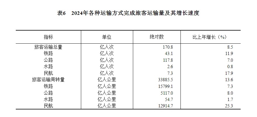 [29]自2024年1月起,公路旅客運(yùn)輸量、公路旅客運(yùn)輸周轉(zhuǎn)量統(tǒng)計口徑進(jìn)行了調(diào)整,將班車包車客運(yùn)量、公共汽電車城際城鄉(xiāng)客運(yùn)量、出租汽車(含巡游出租汽車、網(wǎng)絡(luò)預(yù)約出租汽車)城際城鄉(xiāng)客運(yùn)量納入公路旅客運(yùn)輸量統(tǒng)計,公路旅客運(yùn)輸周轉(zhuǎn)量統(tǒng)計口徑相應(yīng)調(diào)整。2024年旅客運(yùn)輸總量、旅客運(yùn)輸周轉(zhuǎn)量、公路旅客運(yùn)輸量、公路旅客運(yùn)輸周轉(zhuǎn)量增速按可比口徑計算。