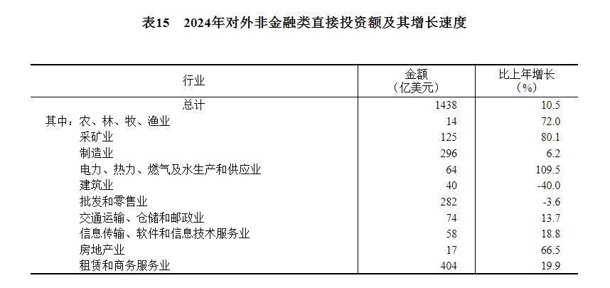 全年對外非金融類直接投資額10245億元,比上年增長11.7%,折1438億美元,增長10.5%。其中,對共建“一帶一路”國家非金融類直接投資額2399億元,增長6.5%,折337億美元,增長5.4%。
