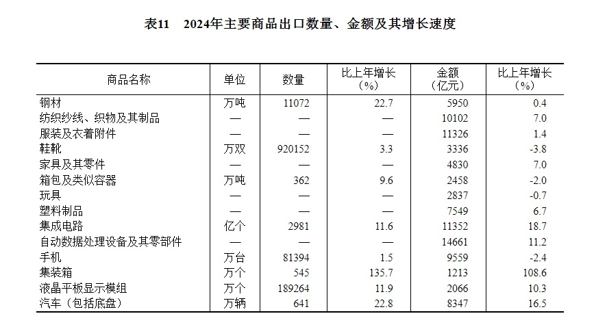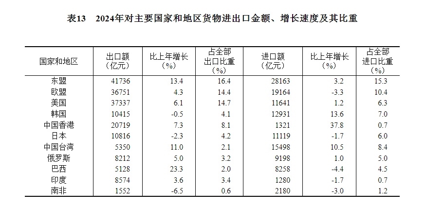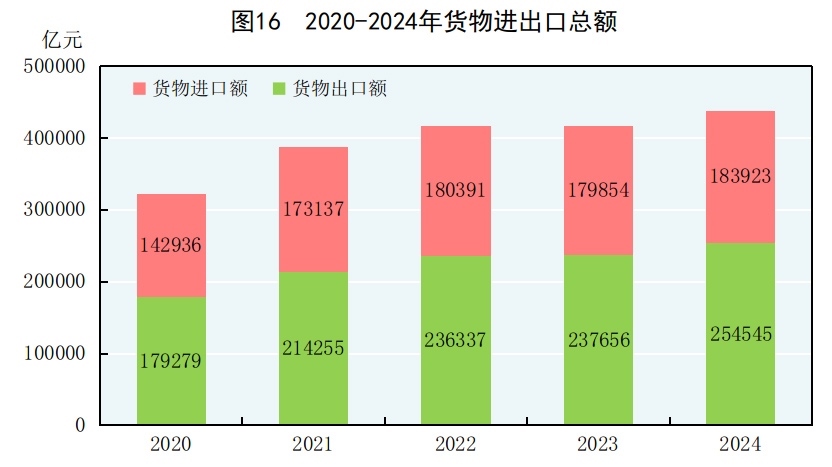 全年貨物進(jìn)出口總額438468億元,比上年增長5.0%。其中,出口254545億元,增長7.1%;進(jìn)口183923億元,增長2.3%。貨物進(jìn)出口順差70623億元。對共建“一帶一路”[50]國家進(jìn)出口額220685億元,比上年增長6.4%。其中,出口122095億元,增長9.6%;進(jìn)口98589億元,增長2.7%。對《區(qū)域全面經(jīng)濟(jì)伙伴關(guān)系協(xié)定》(RCEP)其他成員國[51]進(jìn)出口額131645億元,比上年增長4.5%。民營企業(yè)進(jìn)出口額243329億元,比上年增長8.8%,占進(jìn)出口總額比重為55.5%;其中出口164717億元,增長9.4%。