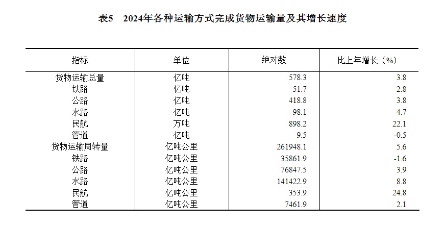 [28]貨物運(yùn)輸總量及周轉(zhuǎn)量包括鐵路、公路、水路、民航和管道五種運(yùn)輸方式完成量,2024年增速按可比口徑計算。