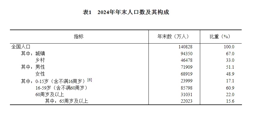 年末全國人口[5]140828萬人,比上年末減少139萬人,其中城鎮(zhèn)常住人口94350萬人。全年出生人口954萬人,出生率為6.77‰;死亡人口1093萬人,死亡率為7.76‰;自然增長率為-0.99‰。