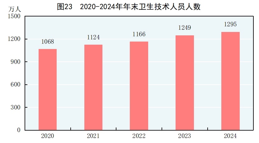 年末全國共有醫(yī)療衛(wèi)生機(jī)構(gòu)109.2萬個,其中醫(yī)院3.9萬個,在醫(yī)院中有公立醫(yī)院1.2萬個,民營醫(yī)院2.7萬個;基層醫(yī)療衛(wèi)生機(jī)構(gòu)104.0萬個,其中鄉(xiāng)鎮(zhèn)衛(wèi)生院3.3萬個,社區(qū)衛(wèi)生服務(wù)中心(站)3.7萬個,門診部(所)39.8萬個,村衛(wèi)生室57.1萬個;專業(yè)公共衛(wèi)生機(jī)構(gòu)9217個(不含衛(wèi)生監(jiān)督所、中心),其中疾病預(yù)防控制中心3429個。衛(wèi)生技術(shù)人員1295萬人,其中執(zhí)業(yè)醫(yī)師和執(zhí)業(yè)助理醫(yī)師505萬人,注冊護(hù)士584萬人。醫(yī)療衛(wèi)生機(jī)構(gòu)床位1037萬張,其中醫(yī)院818萬張,鄉(xiāng)鎮(zhèn)衛(wèi)生院151萬張。全年總診療人次[79]101.1億人次,出院人次[80]3.1億人次。
