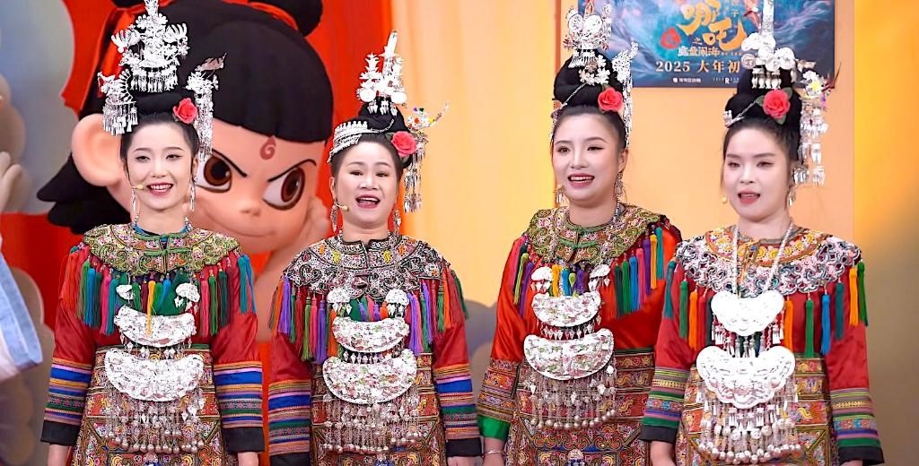 近日,貴州“舞樂蟬歌”樂團的成員們,在電影《哪吒之魔童鬧?!返男麓呼[海直播現(xiàn)場表演侗族大歌。(受訪者供圖)