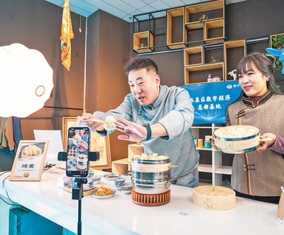 3月19日,內(nèi)蒙古呼和浩特市玉泉區(qū)數(shù)字經(jīng)濟(jì)總部基地直播間內(nèi),主播在推薦地方特色美食燒麥。