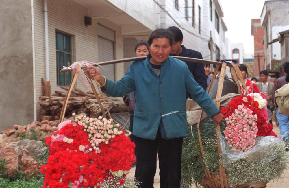 云南省昆明市呈貢龍街鄉(xiāng)斗南村是中國有名的“花鄉(xiāng)”,全村幾乎家家種花。這是一位當(dāng)?shù)鼗ㄞr(nóng)挑著一擔(dān)鮮花去花卉交易市場(chǎng)出售(1999年6月2日發(fā))。