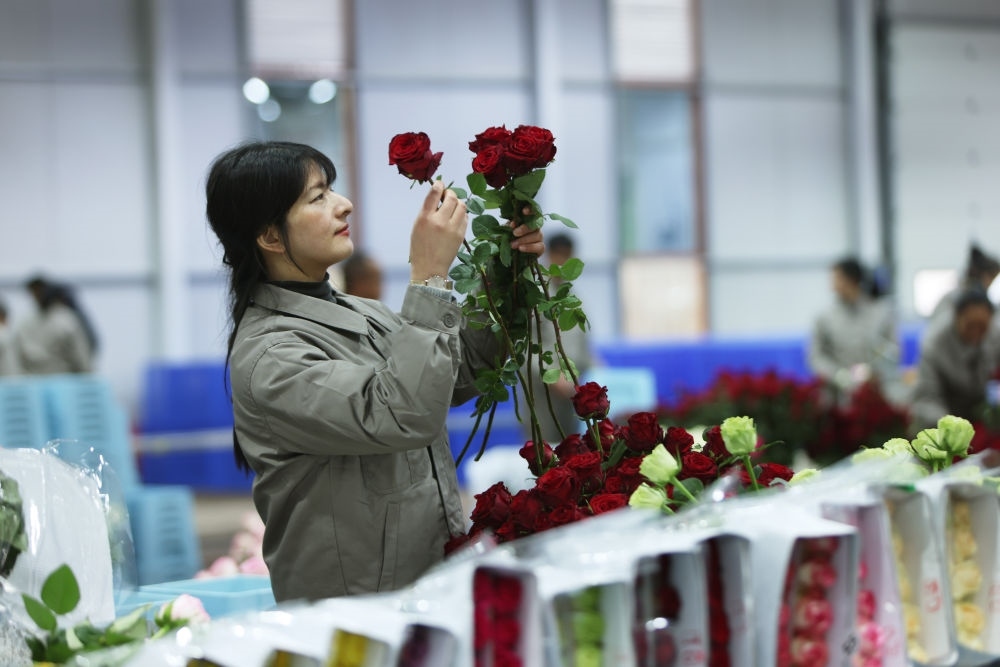 2017年2月14日,消費(fèi)者在云南省昆明市斗南花卉市場(chǎng)選購玫瑰花。