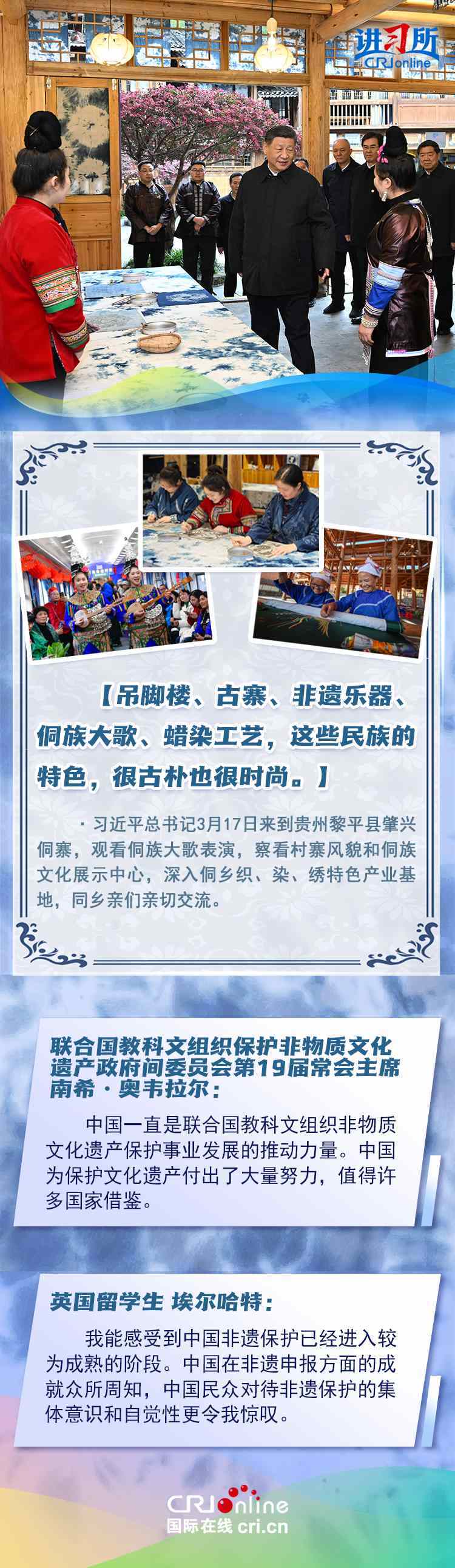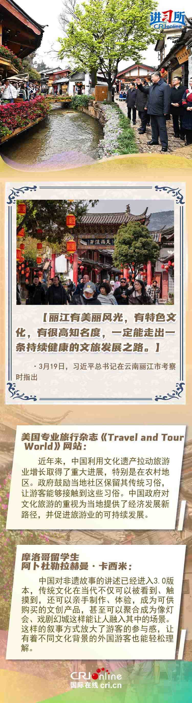 習近平總書記近日赴貴州、云南考察。他走進民族特色村寨、歷史文化古城,心系歷史文化遺產(chǎn)保護和文旅融合發(fā)展。習近平特別叮囑當?shù)毓賳T和群眾,既要保護有形的村落、民居、特色建筑風貌,傳承無形的非物質文化遺產(chǎn),又要推動其創(chuàng)造性轉化、創(chuàng)新性發(fā)展。