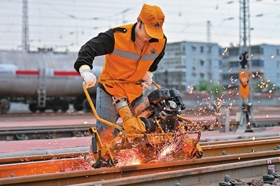 國鐵鄭州局新鄉(xiāng)橋工段職工在檢查整修鐵路道岔設備。