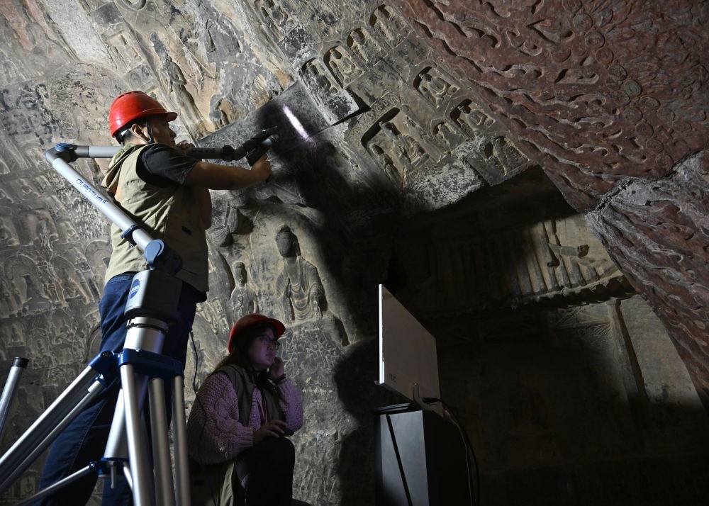 2025年4月9日,龍門石窟研究院工作人員在古陽洞使用關節(jié)臂掃描儀對像龕進行數(shù)字化掃描。