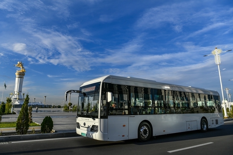 這是2023年11月26日在土庫曼斯坦阿爾卡達(dá)格拍攝的電動公交車。新華社記者 曹陽 攝