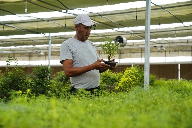 2024年7月28日,在烏茲別克斯坦錫爾河州的上合組織農(nóng)業(yè)基地中烏現(xiàn)代農(nóng)業(yè)科技示范園,工作人員檢查盆栽植物。新華社發(fā)(扎法爾?攝)
