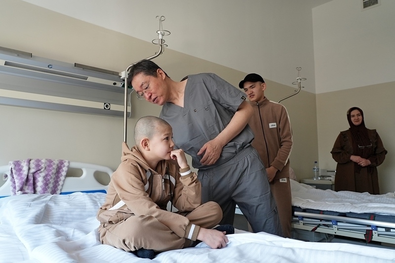 2025年2月20日,在位于烏茲別克斯坦塔什干的共和國耳鼻喉科及頭頸疾病專業(yè)科學(xué)實踐醫(yī)療中心,劉玉和醫(yī)生(左二) 在術(shù)前查看患兒情況。新華社發(fā)(扎法爾?攝)