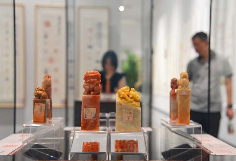6月21日,觀眾在北京市海淀區(qū)三山五園文化藝術(shù)中心參觀薪傳國(guó)粹——“萬印樓”新藏當(dāng)代國(guó)際篆刻精品展。