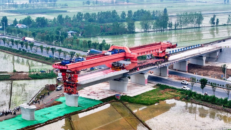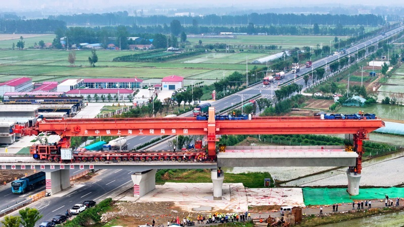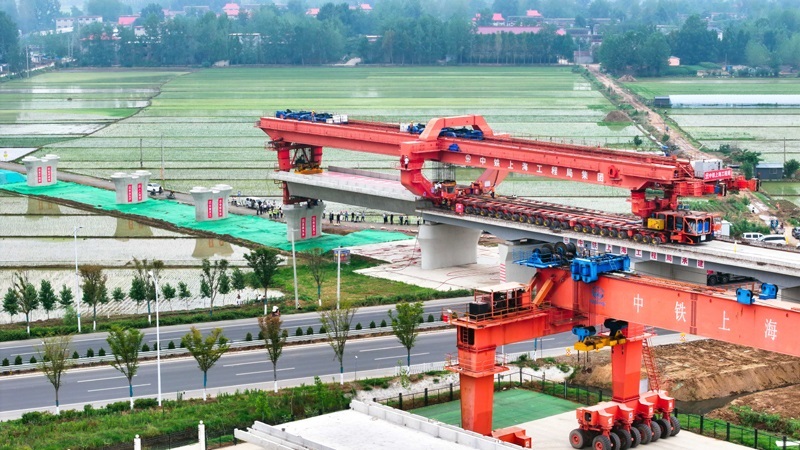 6月21日,在濰宿高鐵郯城沭河特大橋施工現(xiàn)場(chǎng),中鐵上海局工作人員在進(jìn)行箱梁架設(shè)(無人機(jī)照片)。