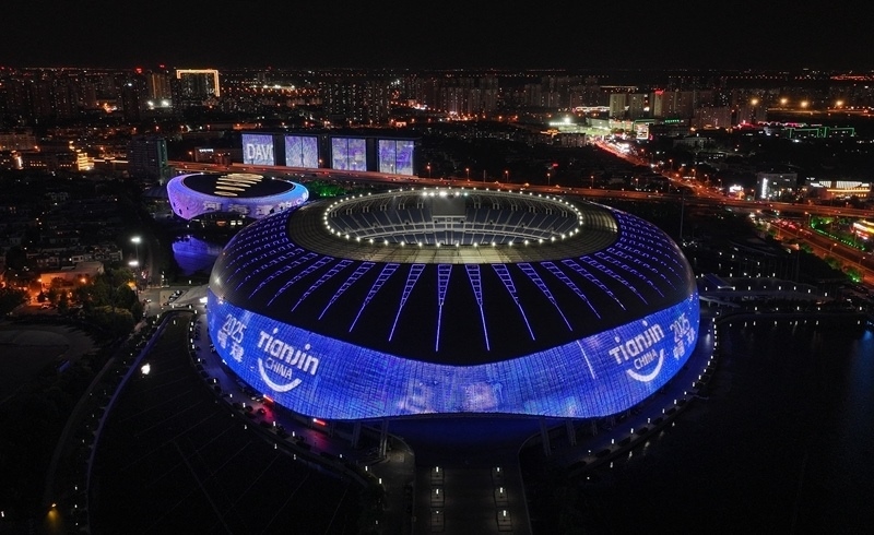 天津奧體中心體育場(chǎng)點(diǎn)亮夏季達(dá)沃斯主題燈光(無人機(jī)照片,6月20日攝)。