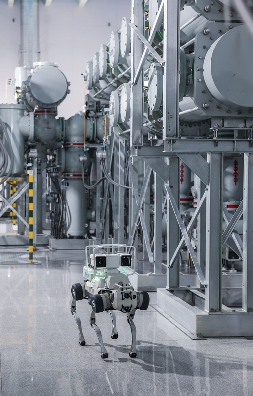 6月24日,機(jī)器狗在舟山望海(金塘)220千伏輸變電工程的變電站GIS室內(nèi)巡查。