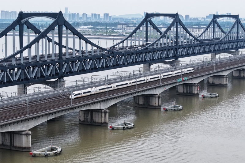 6月30日,一列動車組列車經(jīng)過武漢天興洲大橋延長線(無人機照片)。