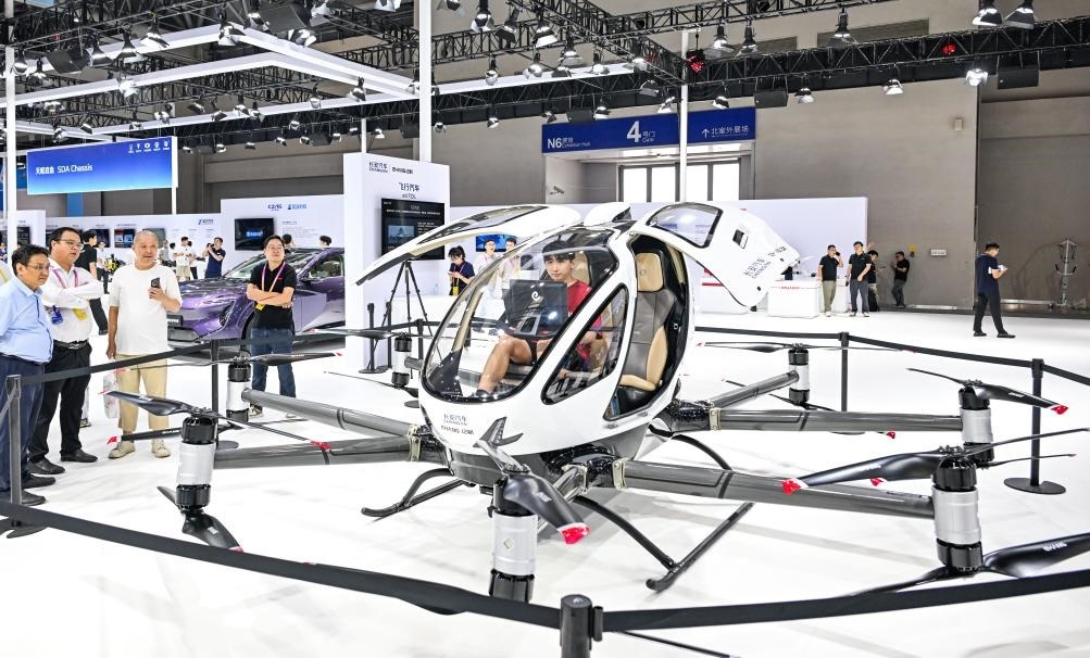 2025年9月5日,在重慶舉行的2025世界智能產(chǎn)業(yè)博覽會上,觀眾在長安汽車展區(qū)參觀、體驗“飛行汽車”。新華社記者王全超攝