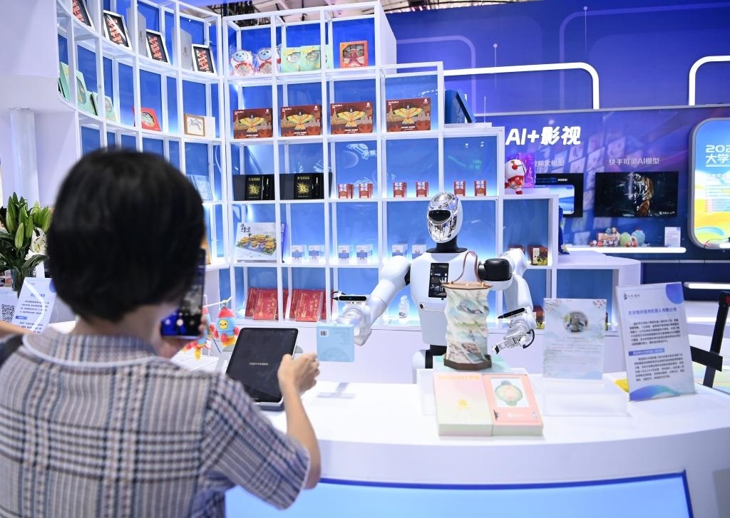 9月11日,在服貿(mào)會(huì)文旅服務(wù)專題展區(qū),參觀者在“海淀有禮文創(chuàng)機(jī)器人快閃店”與機(jī)器人互動(dòng)。新華社記者 肖瀟 攝