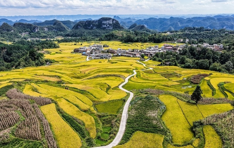 長順縣長寨街道擺塘梯田風光(9月17日攝,無人機照片)。