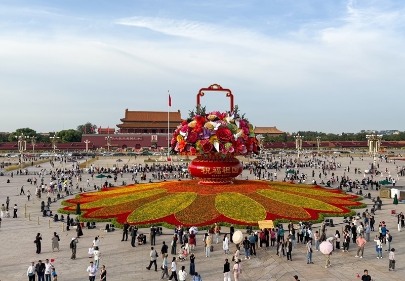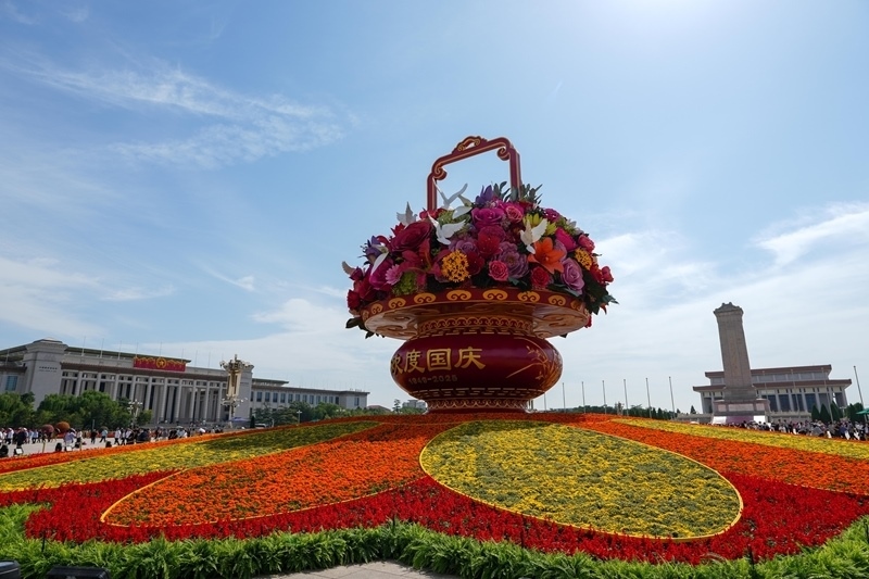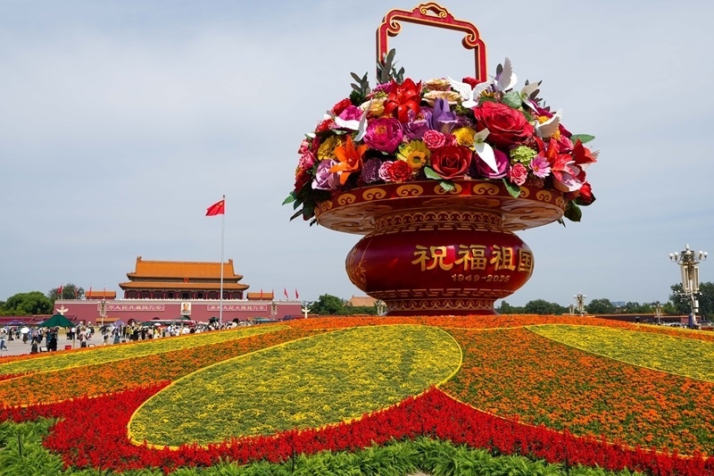9月25日,2025年“祝福祖國(guó)”巨型花籃正式完工,亮相天安門廣場(chǎng)與市民共度佳節(jié)。今年“祝福祖國(guó)”花壇以喜慶的花籃為主景,花壇頂高18米,籃體高16米,籃盤直徑12米?;@體南側(cè)書寫“祝福祖國(guó)”“1949-2025”字樣,籃體北側(cè)書寫“歡度國(guó)慶”“1949-2025”字樣?;@內(nèi)選取了美好寓意的花卉,其中荷花寓意“和和美美”、橄欖枝寓意“榮耀和平”等,還結(jié)合和平鴿元素,體現(xiàn)“和平發(fā)展、欣欣向榮”。