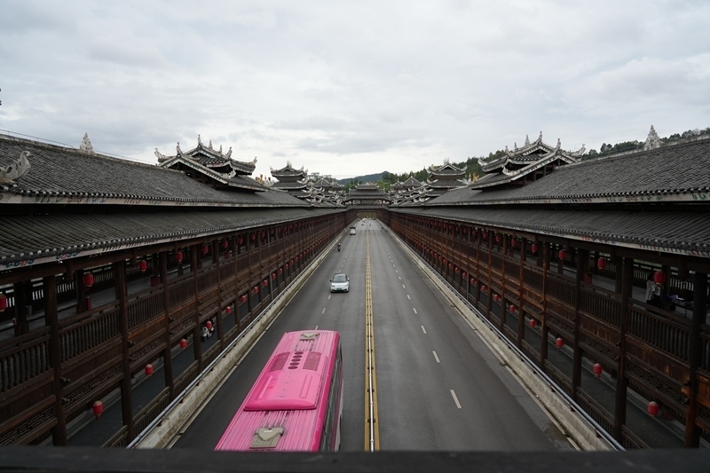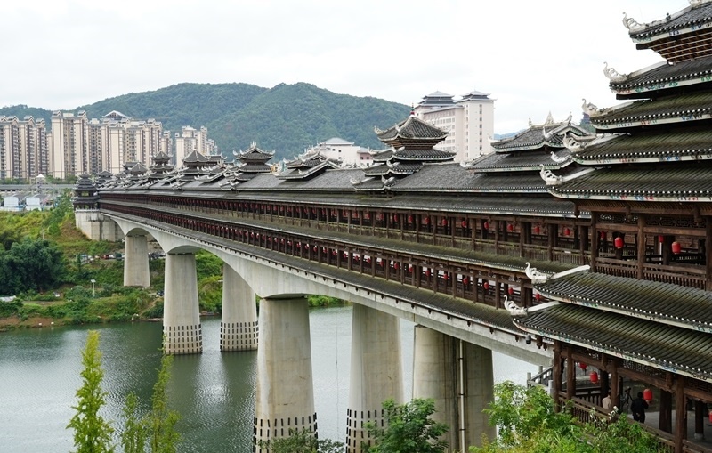 這是9月25日拍攝的三江侗族自治縣的宜陽風雨橋。該橋橫跨潯江之上,全長399.6米,寬28米。橋面設(shè)雙向四車道,橋上共兩層,二層建有跨橋人行通道。