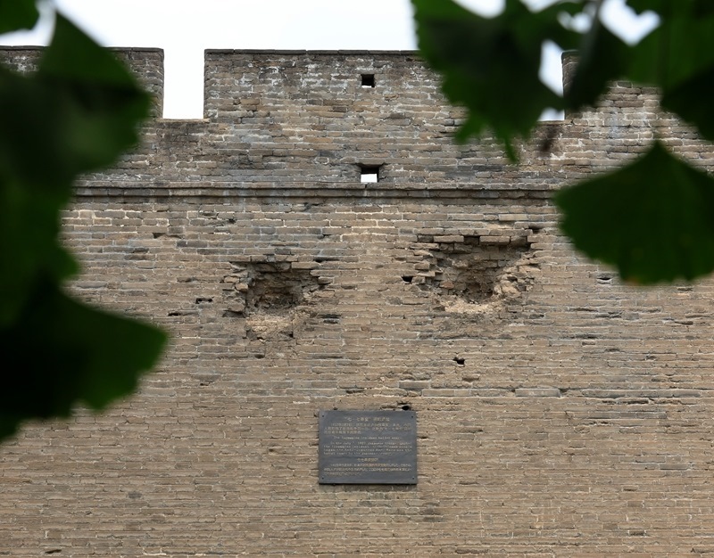 這是7月4日拍攝的宛平城城墻上的彈坑遺跡。