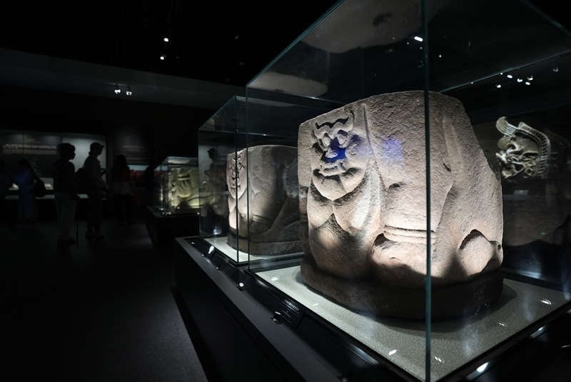 7月9日在西夏陵博物館拍攝的西夏陵出土文物紅砂巖石雕力士志文支座。
