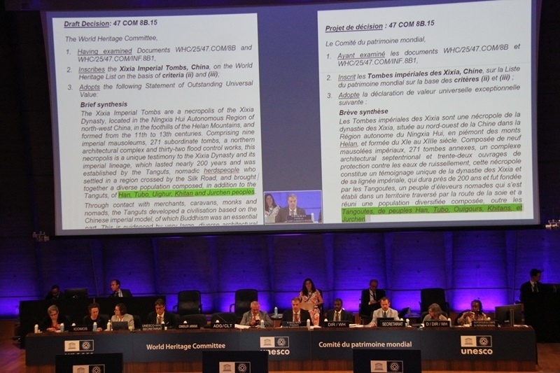 7月11日,在法國巴黎召開的聯(lián)合國教科文組織第47屆世界遺產(chǎn)大會(huì)審議將“西夏陵”列入《世界遺產(chǎn)名錄》的決議草案。